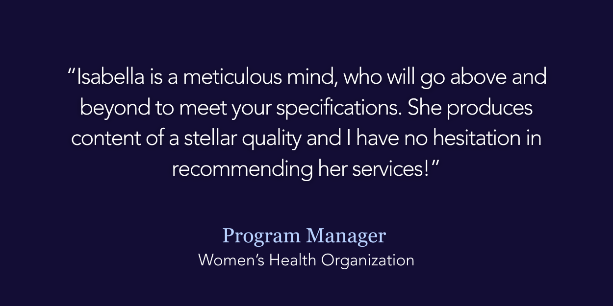 "Isabella is a meticulous mind, who will go above and beyond to meet your specifications. She produces content of a stellar quality and I have no hesitation in recommending her services!"